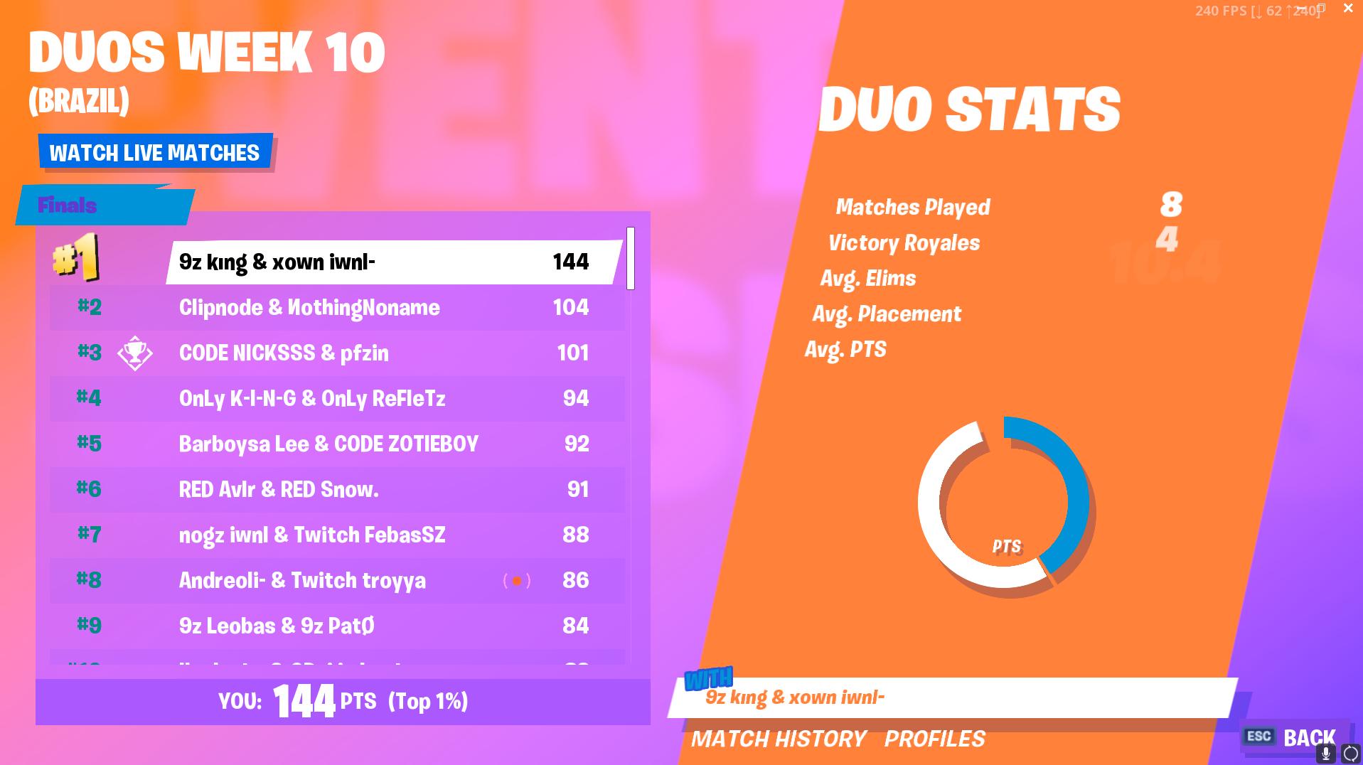 La pareja albiceleste acumuló 144 puntos en la final de la décima semana de competencia y le sacó 38 unidades al segundo, los brasileños K-I-N-G y Refletz. Ganaron cuatro de las ocho partidas disputadas y redondearon una media de eliminaciones superior a diez.